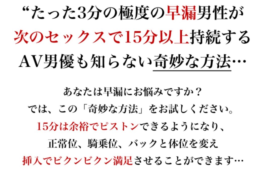 AV男優も知らない『奇妙な方法』で早漏を改善します。効果がなければ全額返金保証付きです。